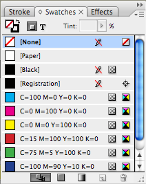 Swatches Panel: If a tintable (hey, there’s a new word) swatch is selected when you summon the panel, the tint field will be highlighted and you need to press tab to get down to the list. Gradient swatches, [Paper], and [None] are not tintable, so if one of them is selected, the list has focus. Once the list has focus, use the arrow keys or start typing the name of the swatch you want. If you have a page item selected, the swatch is immediately applied to it. For more on this, see Anne-Marie’s post, or mine on Publicious.net.
