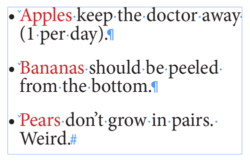 During a past project, I discovered another use for this interesting character. I had a list of items, to which I had applied bullets using the automatic bullet feature (Type > Bulleted & Numbered Lists > Apply Bullets or just click the button in the Control panel). On one of the items, I needed to make the first word red. But this caused the automatic bullet to become red also, since automatic bullets inherit the formatting of the first character of the paragraph.
