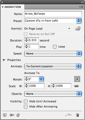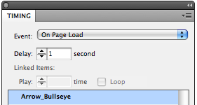 I also made a visit to the Timing panel to specify that the animation not start until 1 second after it loads.