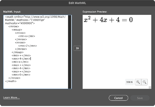 Because MathML is XML-based, you can edit the objects to revise the expression, fix a typo, or change the type size or fill color. Also, because MathML produces vectors, the object can be resized with no loss of resolution.
