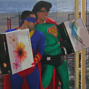 Vector Man (left) and Adobe Man display hero-sized boxes for the new Creative Suite 2.