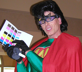 Every year, graphic designers, art directors, photographers, and illustrators gather for several days of software instruction and art-full antics at ADIM, the Art Directors Invitation Masters Class. Last night was the kick-off to the 2005 conference, and in true ADIM fashion, Adobe’s Russell Brown donned outrageous clothes to encourage participants to leave their creative inhibitions at the door.