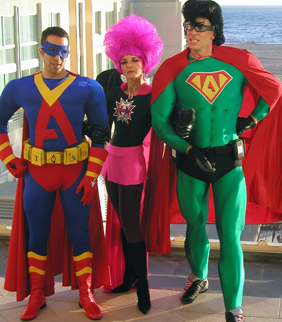 Vector Man, Quarkerella, and Adobe Man take a break from battling each other for a photo opportunity.