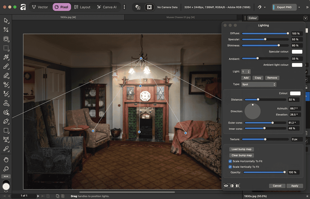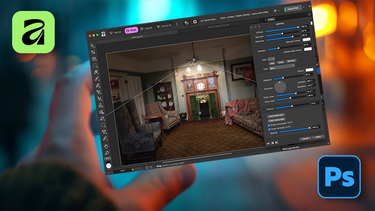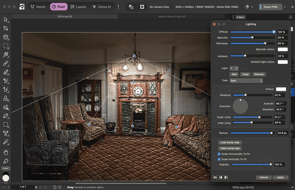 Photoshop used to include a sophisticated Lighting filter before the removal of its 3D capability. Affinity provides almost that same functionality, again directly on the canvas (Figure 7).