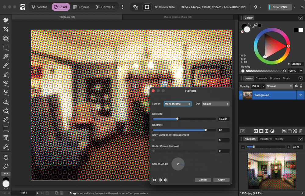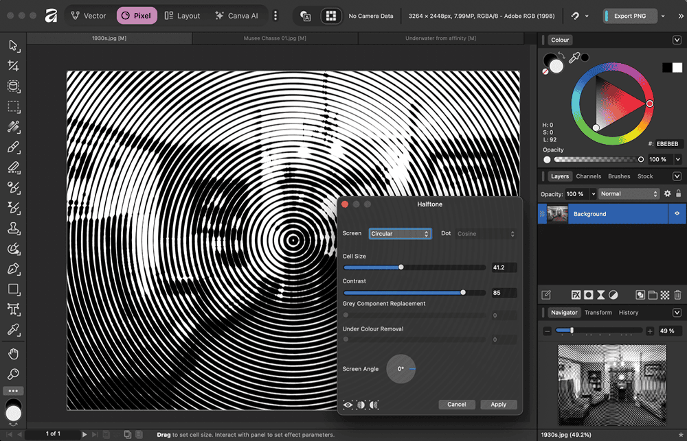 With a full-size preview, the Affinity Halftone filter (Pixel > Filters > Colors > Halftone) lets you set the cell size with a simple slider (Figure 11). You can also adjust contrast, screen angle, and other parameters.