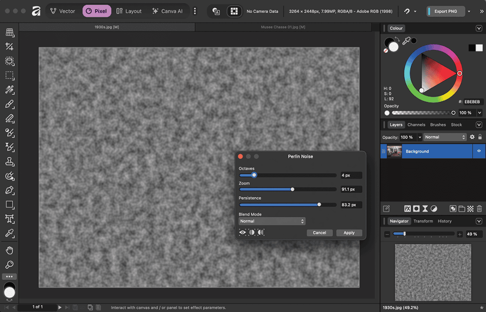 The Photoshop Clouds filter is a one-shot effect, using the foreground and background colors to create a simple random pattern. With its Perlin Noise filter (Pixel > Filters > Noise > Perlin Noise; Figure 13), Affinity lets you do something similar but see exactly what you’re going to get. Dragging the Octaves and Persistence sliders lets you change the complexity of the texture; most useful of all is the Zoom slider, which allows you to set its scale.
