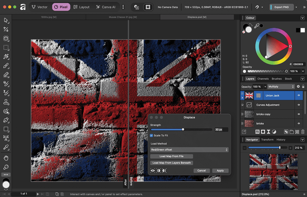 Affinity, on the other hand, enables you to adjust the strength of its Displace filter with a live, real-time preview. Simply choose Pixel > Filters > Distort > Displace to get started.