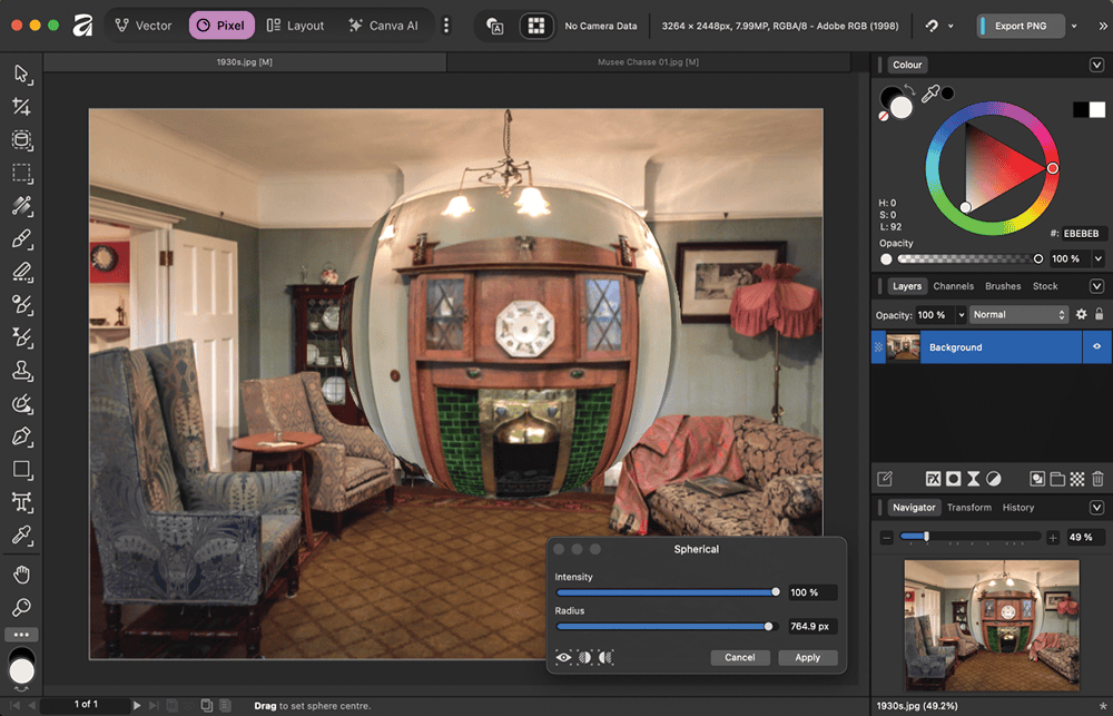 The native Spherize filter in Photoshop operates on the entire canvas (or an active selection), with only a tiny preview window. Affinity’s Spherical filter works directly on your current layer with Intensity and Radius sliders (Figure 2).