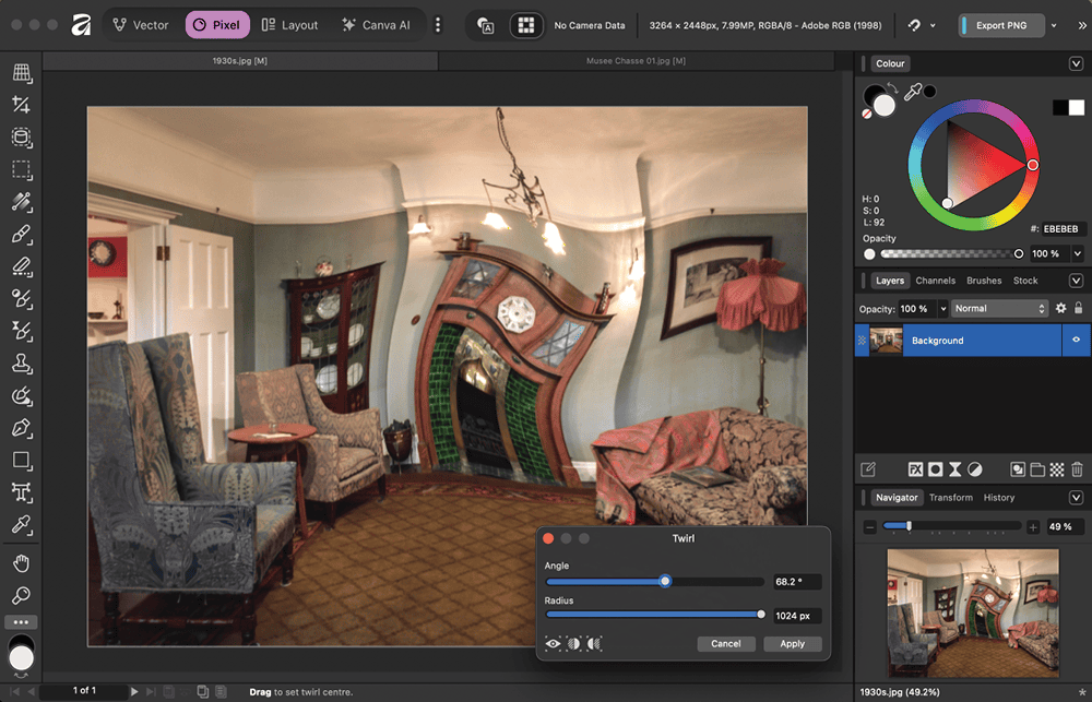 Once again, Affinity improves on a native Photoshop filter by giving the Twirl filter a real-time, full preview (Figure 5). You can set both the angle and radius, plus you can drag the filter around the image to distort exactly the area you require. Again, the slider goes up to only 1024 pixels, but you can type a larger value in the number field.