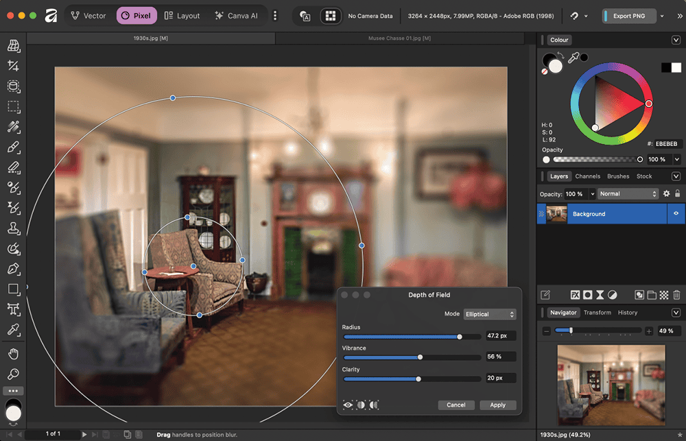 Affinity provides direct, on-canvas versions of several of these blurs, the most interesting being the Depth Of Field Blur (Figure 9). Here you can set not only the blur’s radius but also adjust the result’s vibrance and clarity. Head-up controls, as well as sliders and numerical fields, enable you to fine-tune the result.