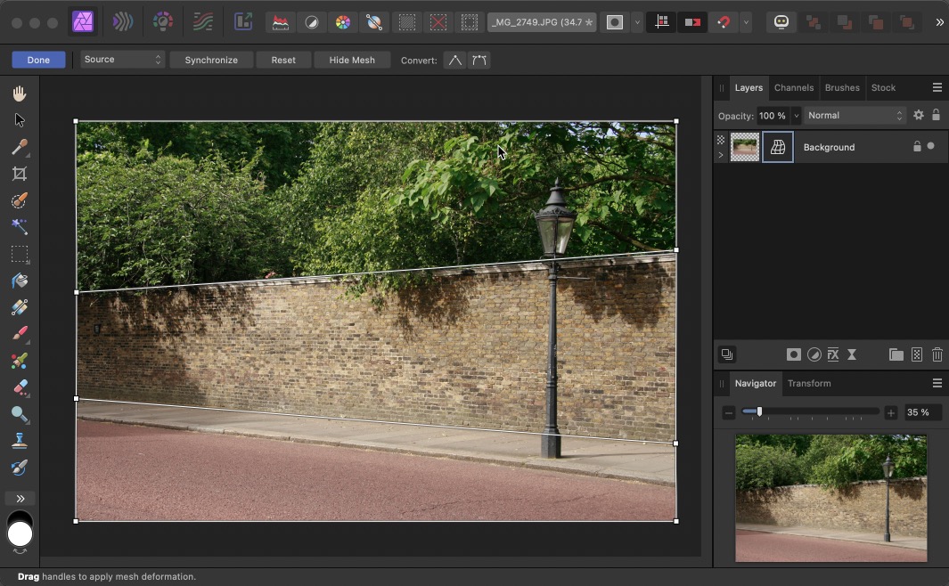 The Mesh Warp feature in Photo now has the novel approach of being able to set control handles on either the Destination or the Source. Here, for instance, is the Mesh Warp being applied to a view of a wall, set to Source mode. I’ve added control handles to the top and bottom of the wall, adjusting the Bézier curves to run along the wall: