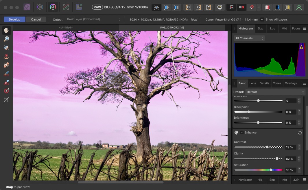 The Photo persona now has a non-destructive RAW processor, which allows you to either embed a RAW image into a composition or to link it to the version on disk. Best of all, when you “develop” a placed RAW image you can choose to see it within the composition, including any other layers that may be above or below it. Here’s the RAW persona in action on the tree layer, while still allowing me to see the Luminosity-based Hue adjustment applied to the sky: