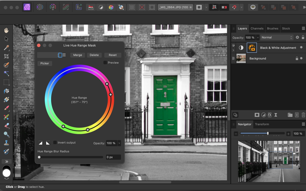 Photo includes a number of automated masking methods, such as a Luminosity Mask that can be applied to Adjustment Layers as well as regular layers. Here, I’ve added a Black & White Adjustment to an image, then applied a Live Hue Range Mask to that adjustment so that the green door is masked, allowing it to be seen in full color.