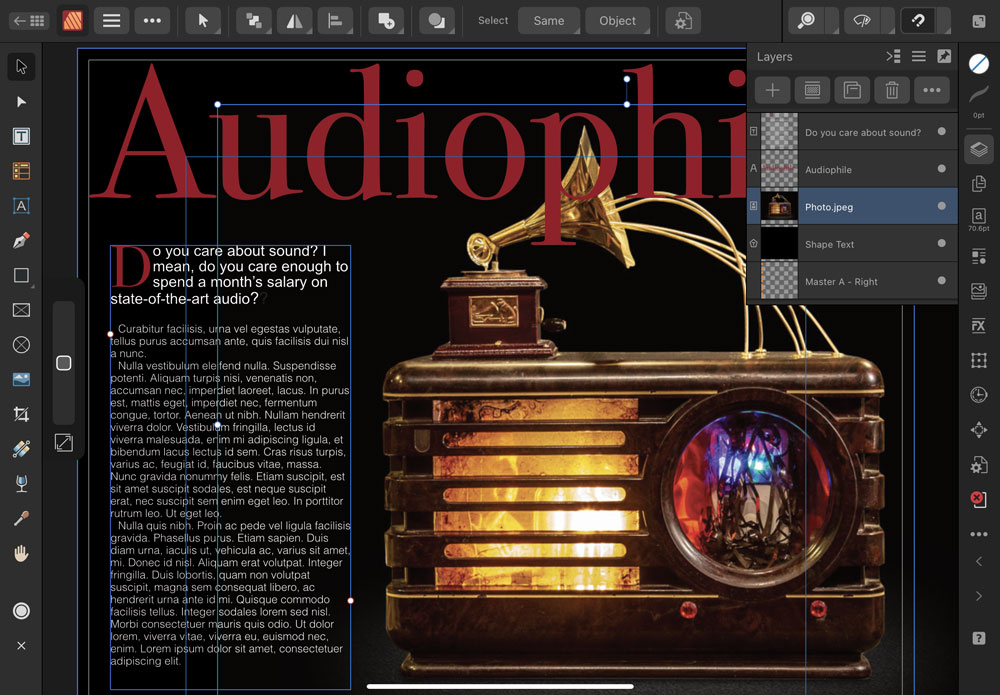 One of the biggest features of Affinity’s apps is that, unlike their Adobe equivalents, they were all created using the same core architecture. Only the toolset changes for each app, or persona, as Affinity calls them. This means that if you’re designing a page in Publisher, you can switch instantly to the Photo persona just by clicking or tapping a button. You’ll see exactly the same view of the document as appeared in Publisher, except that you now have access to all the Photo editing tools.