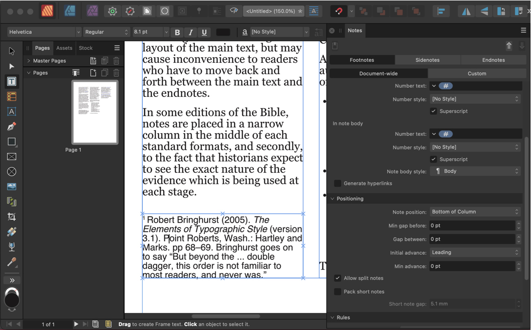 One of the most-requested features in the Publisher persona was the addition of footnotes, and it has been implemented in this release. You can choose not only footnotes, which appear at the bottom of the current page, but also endnotes, which appear at the end of the chapter or document. You can also opt for sidenotes, which can be placed more freely on the page.