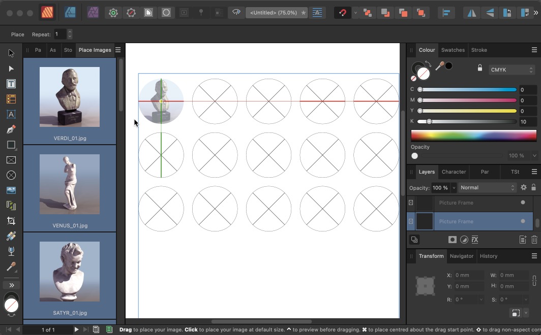 Click at the first location to automatically place all the selected images. You can choose whether the placed images are fully enclosed within the shapes, or sized to cover them; and of course each placed image can easily be adjusted for size and position afterwards.