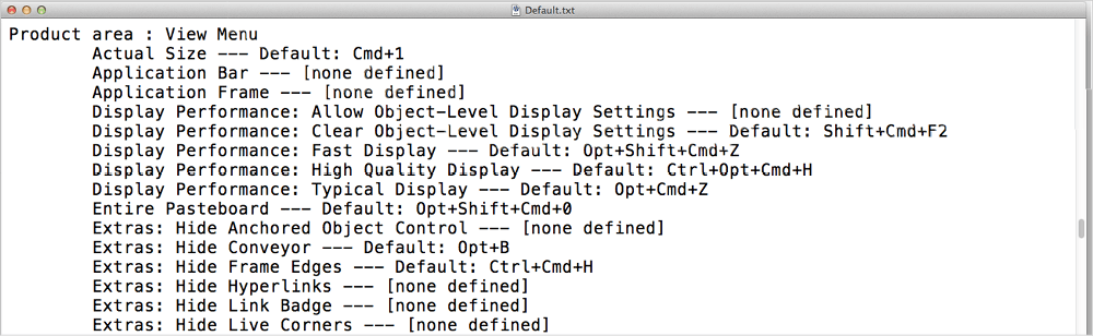 Scale Frame and Content to Specific Measurement Value If you want to scale both an image and the frame containing it to a specific size, you can use the Scale X and/or Scale Y fields in the Control panel. The trick is to include a unit of measure. For example, you can enter 2p in the Scale X field to make a selected object exactly two picas wide. Tweaking Text You can adjust the horizontal and vertical position of text very quickly with several keyboard shortcuts that involve the Option/Alt key. To increase leading, select the text, and then press Option/Alt+Down Arrow; to decrease leading, use Option/Alt+Up Arrow. To increase tracking, select a range of text, and then press Option/Alt+Right Arrow; press Option/Alt+Left Arrow to decrease it (use these same shortcuts with your cursor between two characters to increase and decrease kerning). And finally, to apply baseline shift to selected text, press Option/Alt+Shift along with your Up or Down Arrow keys. Search All Keyboard Shortcuts Quickly with Show Set What do you do when you can’t remember a specific keyboard shortcut in InDesign? Google it? Go to the Help? One method you can use to see a list of all your current keyboard shortcuts (including any you’ve customized) is to choose Edit > Keyboard Shortcuts. You can click around in this dialog box to select menu items and commands and see the shortcuts for each. Even better, you can click the Show Set button, which opens a list of your shortcuts in a plain text file that you can search for elusive items.