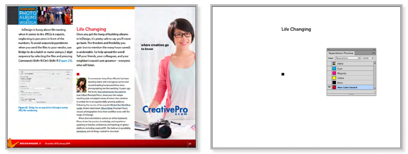 Find that color—The image on the right shows the same document page as the one on the left, using the separations preview to show only those items colored with the spot color.