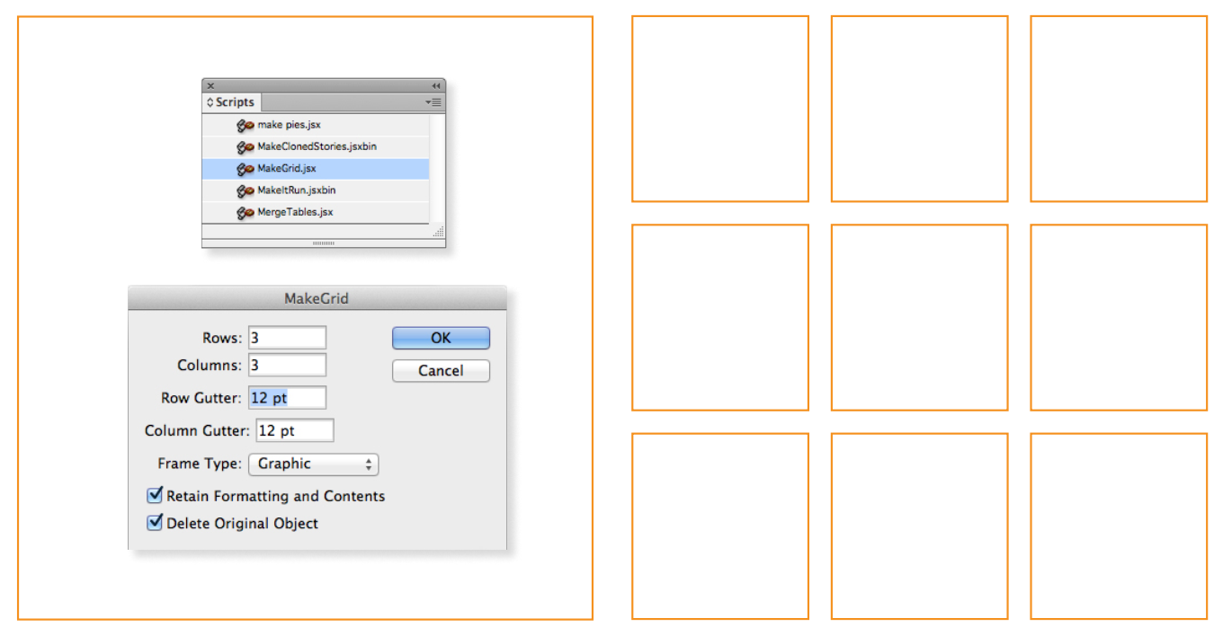 Removing Local Overrides To remove local overrides from text, don’t Option/Alt-click on a style. Instead, click the Remove Local Overrides button in the Paragraph Styles panel or the Control panel. This way is more flexible, because if you select text first, it removes overrides just from the selected text. If you have the cursor flashing, it removes overrides from the whole paragraph. If you have a frame selected, it removes overrides from all text in the frame. Five Guide Tips in One! 1. Double-click the spot on the ruler where you want to add a guide. 2. While dragging a guide, hold the Shift key to have the guide snap to tick marks on the ruler. 3. Hold the Option/Alt key and drag an existing guide to make a copy of it. 4. When you’re dragging a new guide from a ruler, change it from horizontal to vertical (or vice versa) by holding Option/Alt. 5. To create a page guide that extends to the edges of a page, drag a guide from the ruler and release the guide over the page. To create a spread guide that extends to the edges of the pasteboard, drag a guide from the ruler and release the guide over the pasteboard (or hold the Command/Ctrl key while you release the guide). Adjust Spacing Between Objects Select more than one object and start dragging a side or corner handle. While dragging with the mouse, hold down the spacebar; InDesign adjusts the spacing between the objects instead of scaling them. Changing Frames into Grids of Frames Need a whole grid of frames? You could use the Step and Repeat feature, but if you know how large you want the grid and not necessarily how large each frame should be, Step and Repeat can be a hassle. Instead, just draw one big frame to cover the size you want the grid to cover. Then, while that’s selected, open the Scripts panel (Window > Utilities > Scripts) and double-click the MakeGrid script (it’s inside the Samples > JavaScript folder in the panel). That converts any single frame into a bunch of frames on a grid, according to your specifications (how much space between each one, and so on).