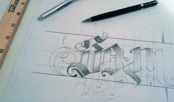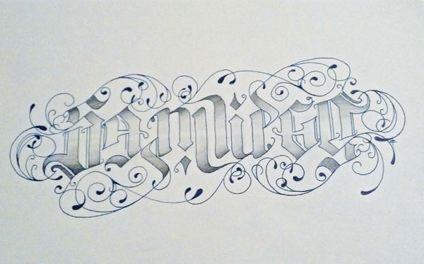 All the work I had done to that point could be ruined if one of my curves was not exactly like the other. I honestly wanted this design to be done completely freehand, so I didn’t use any of my French curves or circle templates that I would normally use, which really brought out a quality in the end design that you don’t get from ambigrams created digitally. That is not to say that I don’t love computer-generated designs. I do, and once I am more proficient in the use of drawing software, I will draw more ambigrams digitally. However, my passion will always be handmade designs.