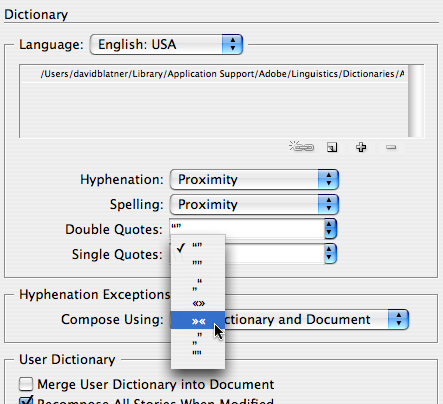 But that’s not the end of the story. Most people don’t realize that the Dictionary pane of the Prefs dialog box lets you control what character you want the quote to turn into. There’s a number of options, based on different languages: