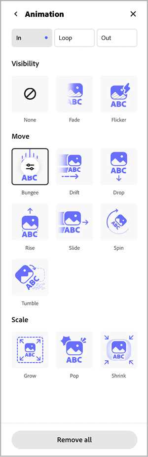 Figure 10. You can apply options from three animation types: In (at the start of the clip), Loop (the whole clip), or Out (at the end of the clip).