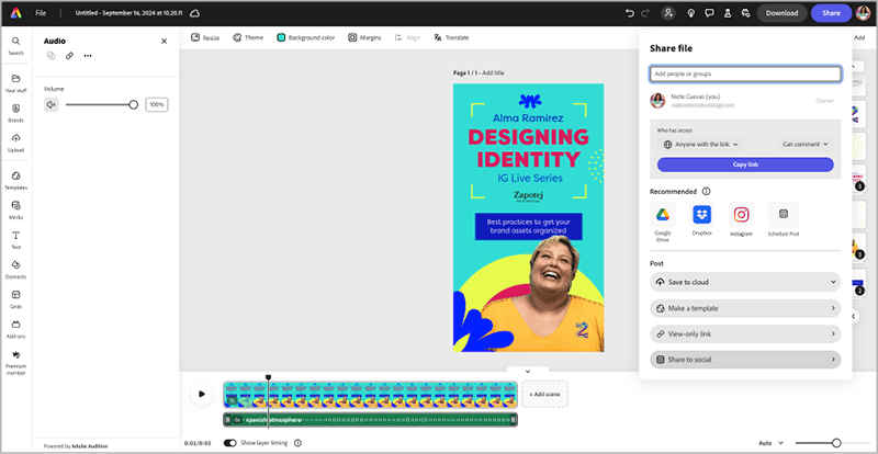 Your graphic is ready for approval! Instead of jumping to email, you can share a link with your team to preview the design directly from Adobe Express. Click the purple Share button (top right). You can share a link that only specific people can access via an email invitation, or you can create a link that you can freely share with anyone.