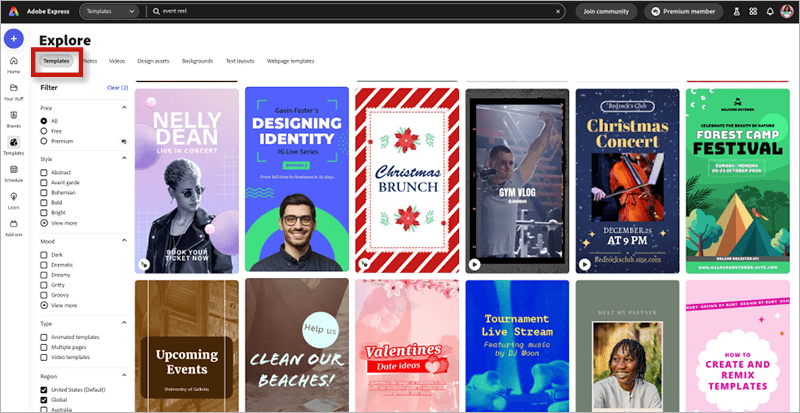 Because video content is in high demand, let’s look for a vertical video to promote an event. Click Search, enter event reel, and several templates show up. If you need to refine your results, the left menu panel lets you filter them by Price, Style, Mood, Type, and Region.
