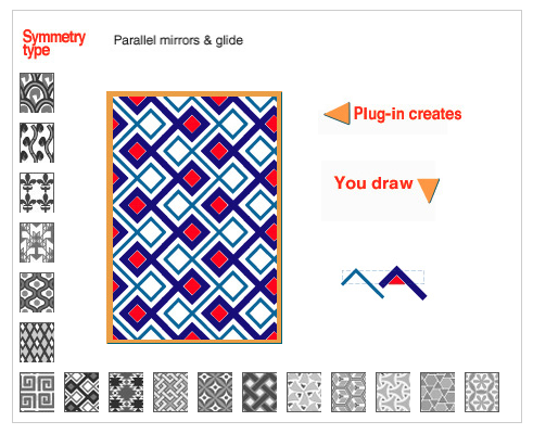 SymmetryWorks offers lots of advantages over Illustrator’s built-in pattern creation tools, including 17 types of symmetry, counterchange patterns, and many other efficiency features. Check out the Pattern Sampler to view all 17 types of symmetry you can use in SymmetryWorks.