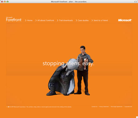 McCann San Francisco asked us to produce a Web site in support of a campaign for Microsoft Forefront, an anti-virus product. The concept is that fighting off ninjas, aliens, spies, and zombies is easy; fending off hackers using Forefront is easier.