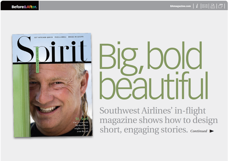 An in-flight magazine has neither a regular audience nor a common topic. Because of this, it must present its material in unique, attention-getting ways. Spirit’s short, easy-to-read articles illustrate how to design for quick impact, beautifully. Let’s see what we can learn. This 15-page article from issue 46 of Before&After Magazine shows how to design short, engaging stories for print.