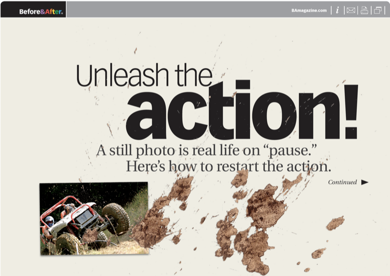 A still photo is a moment from real life on “pause.” What’s cool about design is that the designer can restart the action. The key is to think image first, not layout. Describe its lines, shapes, directions and so on, then repeat or complement them with type, color, and layout. This 16-page article from issue 42 of Before&After Magazine shows you how to use type, color, and layout to capture the energy of live action.
