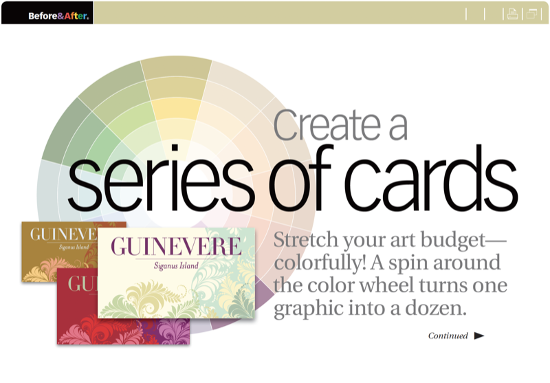 These small, tent-style cards needed to be different but look like a series and be easy and inexpensive. The time-saving solution? A single piece of stock art colored a dozen ways. This 28-page article from issue 49 of Before&After Magazine shows you how to take a a spin around the color wheel and turn one graphic into a dozen.