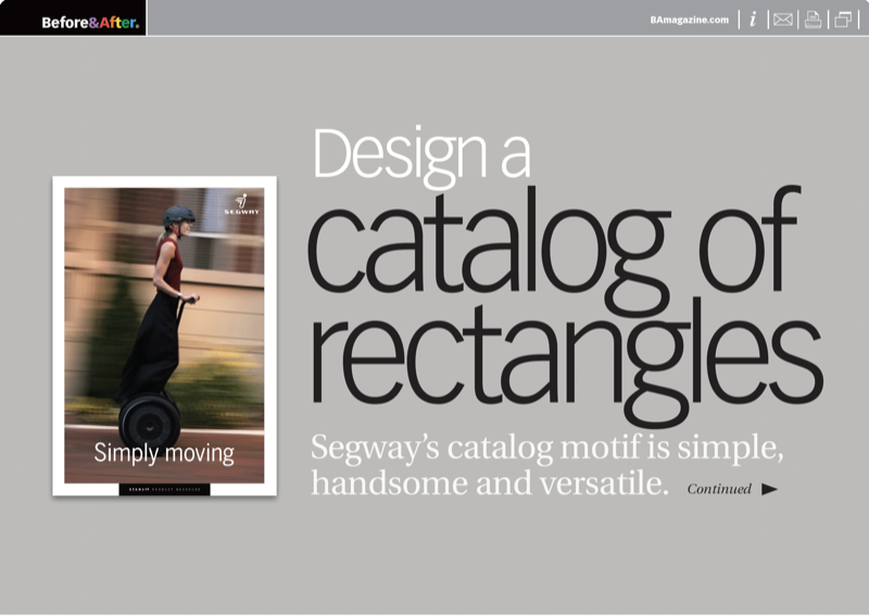 A 28-page catalog provides an attractive synthesis of text and images in a simple, rectangular format. We like how the underlying design structure of rectangles make it easy to blend different elements into a uniform whole. This 12-page article from issue 46 of Before&After Magazine uses a catalog motif that is simple, handsome, and versatile..