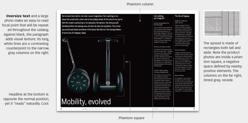 Inside, the catalog is designed in two levels, one to browse and one to read. A big photo and a short block of big type are for browsing. Regular text columns are for detailed reading. Massive black sets the visual theme.