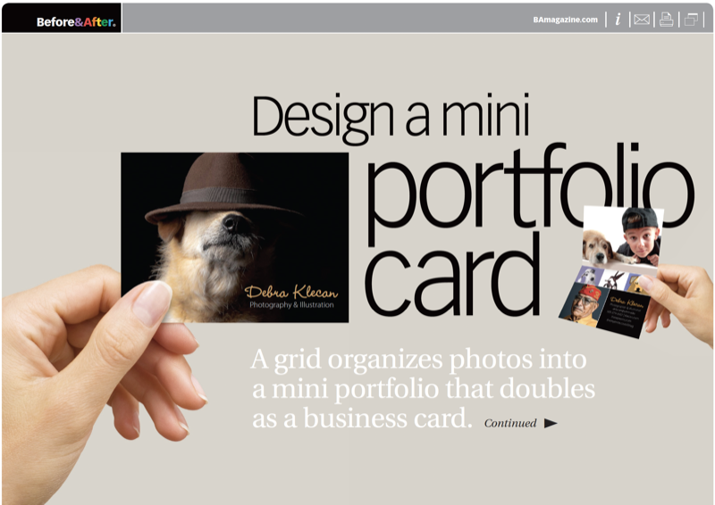 A photographer was expanding her small business and was updating her postcard-size card to reflect her maturing style. Here’s how we helped her make it better. This 18-page article from issue 51 of Before&After Magazine teaches you to use a grid to organize photos into a mini portfolio that doubles as a business card.
