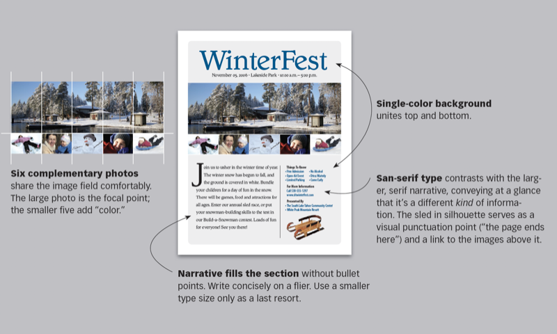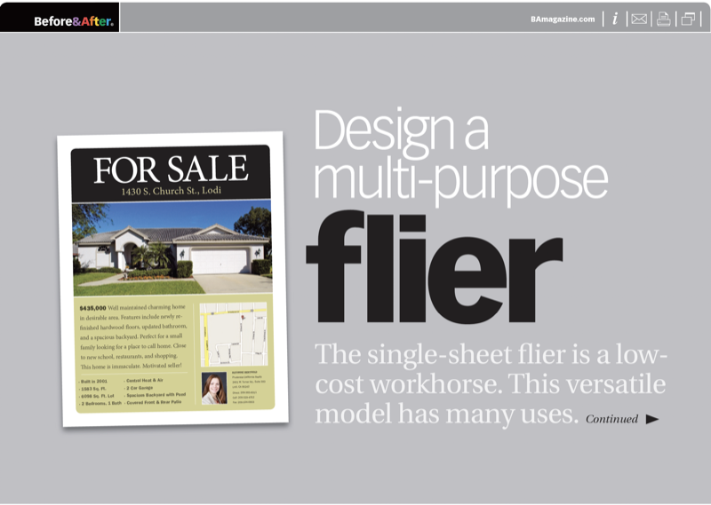 With today’s color printers, your single-sheet flier can look vibrant. But who has time to design it well? If you work from a model, you do! A model makes your design decisions for you—headline goes here, photo goes there, and so on. This saves time, and if you have a series of fliers, you project a consistent look while not reinventing the wheel on every page. This 16-page article from issue 43 of Before&After Magazine shows you how to create a template for that low-cost workhorse—a single-sheet flier, which is inexpensive to make and easy to distribute.