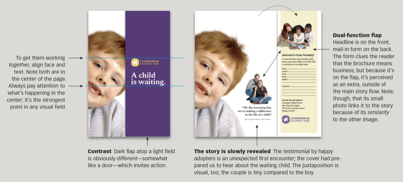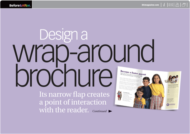 This simple legal-size brochure is a sheet with a narrow panel that’s hard to resist opening to see what’s inside. Make the most of its storytelling format (beginning, middle, end) by setting up your design in five parts, each building on the one before. This 13-page article from issue 44 of Before&After Magazine inspires you to make a brochure with a narrow flap to create a point of interaction with the reader.