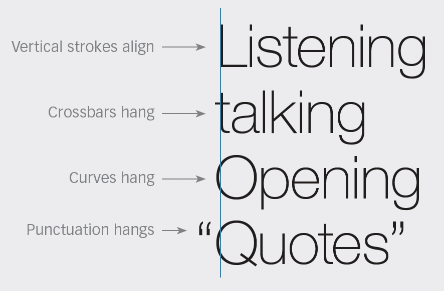 Have you sometimes noticed that type aligned vertically doesn’t look that way? That’s because while your margin is straight, the alphabet isn’t, and its curves, crossbars and punctuation marks can create the appearance of misalignment. InDesign’s Optical Margin Alignment will fix that: