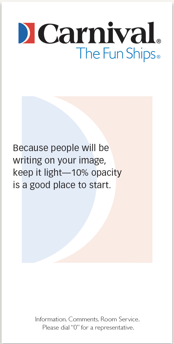 We’re not big fans of ghosted logos, which are normally overlaid by text, weakening (or obscuring) the image and complicating reading. But here’s a great exception: a 3½ in. × 7 in. notepad that shows off your logo and lets the reader cover it up—s-l-o-w-l-y spending time literally atop your image!