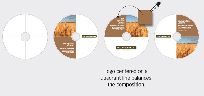 Dividing the space into quarters imposes a grid on the circle that makes your design decisions easier—image goes in one quarter, text in another, logo in a third. The quickest way to color-coordinate the text field is to sample it from the image.