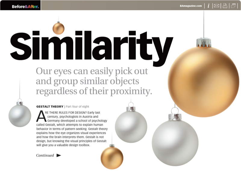 Early last century, psychologists in Austria and Germany developed a school of psychology called Gestalt, which attempts to explain human behavior in terms of pattern seeking. Gestalt theory explains how the eye organizes visual experiences and how the brain interprets them. In a visual field, our eyes can easily pick out and group objects that are similar, regardless of their proximity. Elements of similar shape, color, or other attribute can seem to belong together just because they look alike. This 7-page article from issue 52 of Before&After Magazine teaches you to use Gestalt theory and leverage similar shapes, colors, or other attributes in your designs.