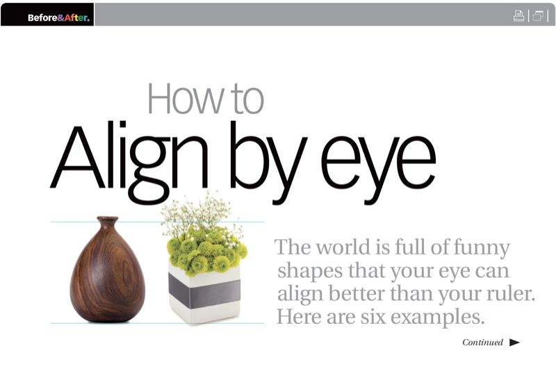 Images of many objects—a chair, a plant, utensils, pillows, a vase—are each a different shape, size, color; the viewing angles are different, and so on. How do you line these up, sized and spaced just so, with other things? We’ll show you why your eye is the best tool you have. This 11-page article from issue 52 of Before&After Magazine teaches you how to use your eye to align images of oddly shaped objects better than your ruler can.