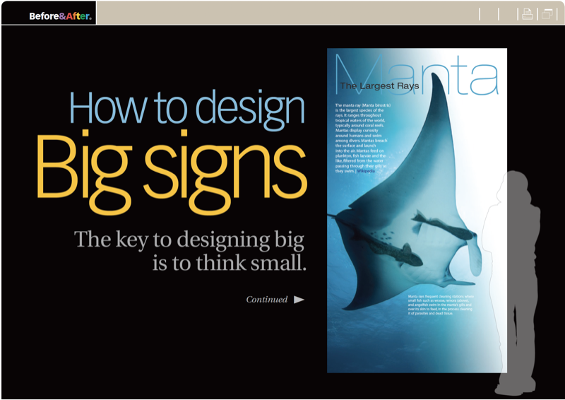 Big signs are everywhere—along freeways, on storefronts, at trade shows, in museums—but no matter how big they are, they share a paradox: At normal viewing distance, they appear small. The key to good design, therefore, is to treat a big sign the same as a tiny one. This 16-page article from issue 50 of Before&After Magazine shows you that the key to designing big is to think small, whether you’re making trade-show banners, billboards, wayfinding signs or wall posters.