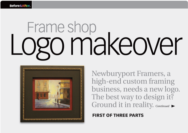For this project, we’ll use a technique called forced random connections. The process is what it sounds like: working from categories loosely related to our key words, match two or more terms, then try to design a logo from the combination. It’s fun! This 29-page article from issue 52 of Before&After Magazine shows you the entire process of making over a logo for a frame shop—a visual identity that will blend the renown of a well-established chain with the personalized experience of a local business. The design should convey the proprietors’ superior craftsmanship while also anchoring their work within the environment it inhabits.