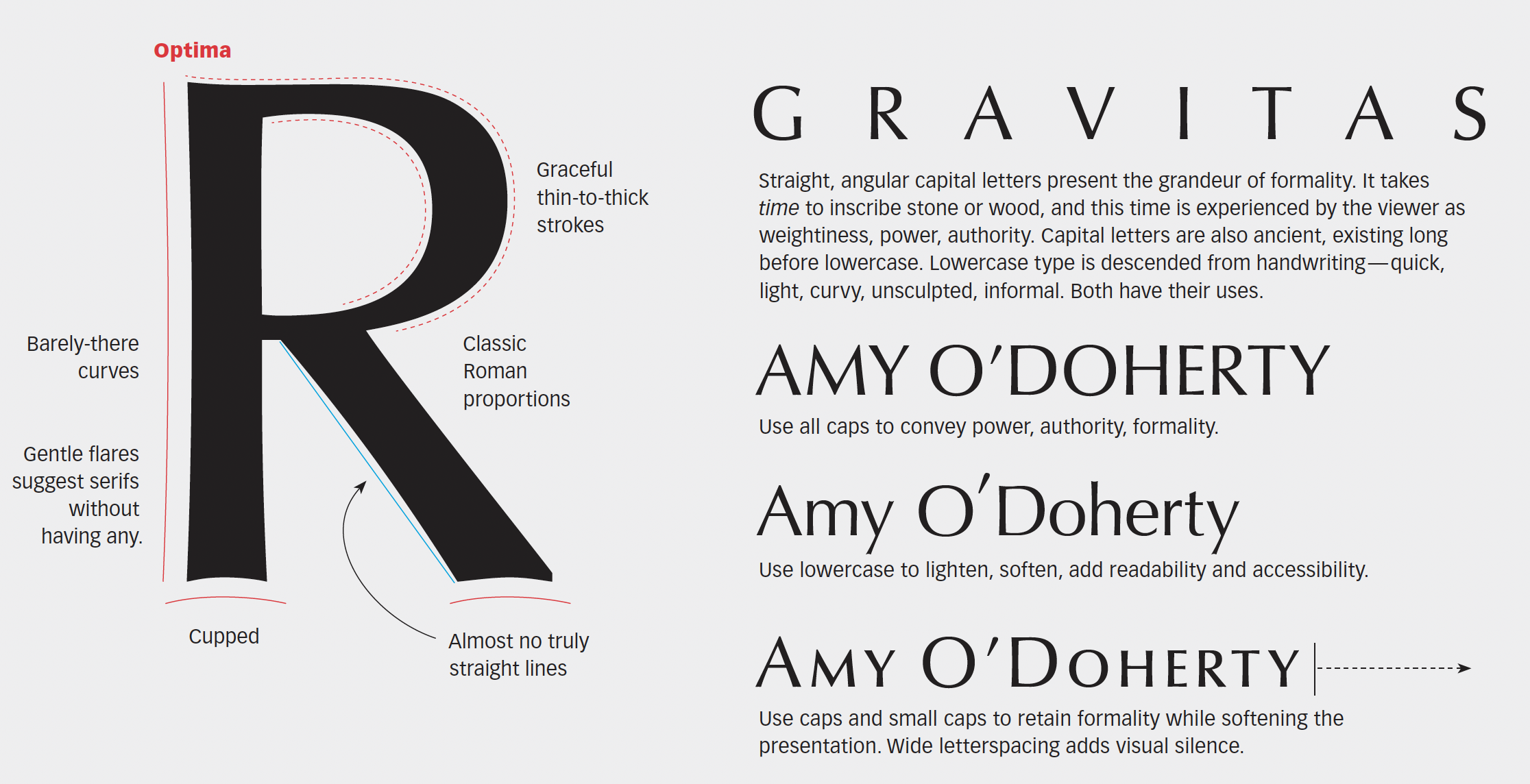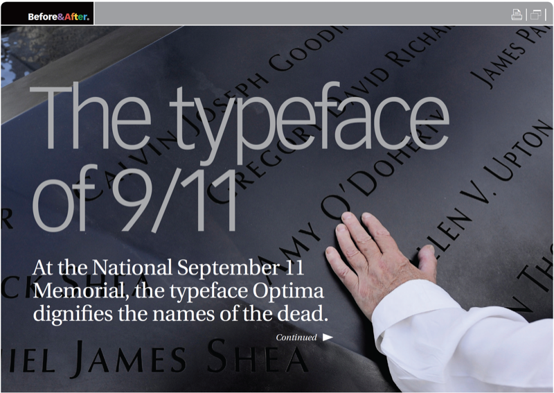 The National September 11 Memorial, Reflecting Absence, conveys loss, nobility, even atonement, in a place of immeasurable sorrow. Optima is the typeface chosen for the work. A typeface of classic Roman shapes and proportions but without serifs, Optima’s graceful lines and uniquely flared strokes evoke the past and future at the same time. This 7-page article from issue 51 of Before&After Magazine shows you how, at the National September 11 Memorial, the typeface Optima dignifies the names of the dead.