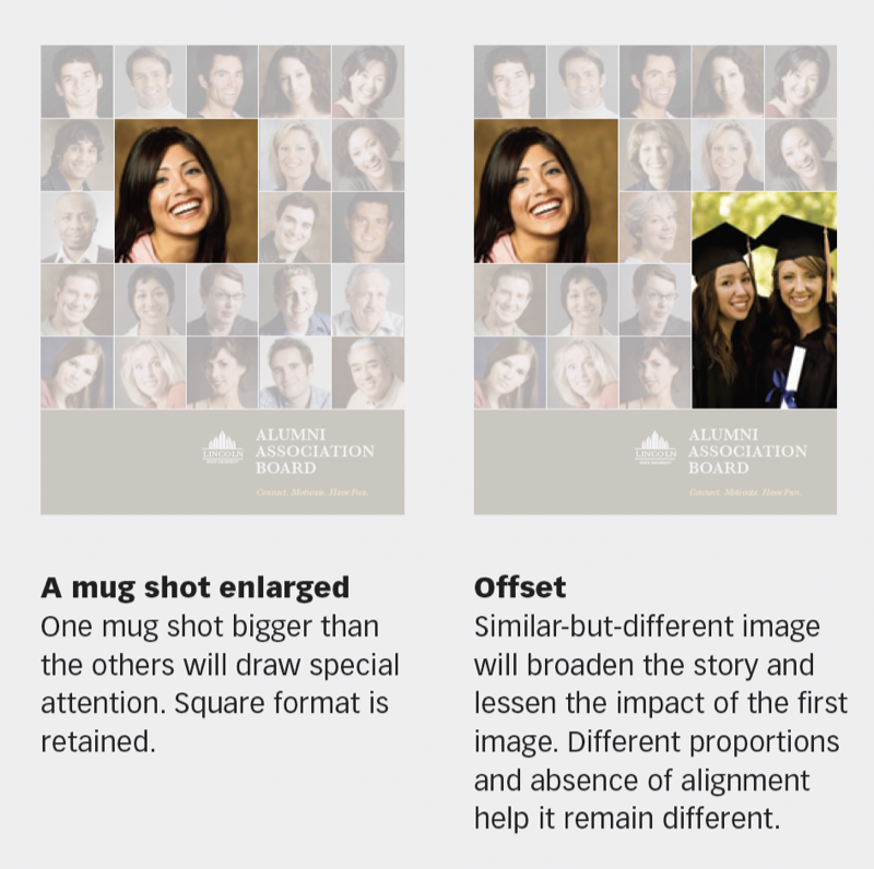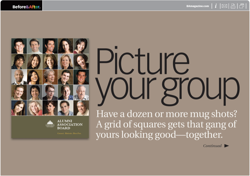 We humans have different faces, hairstyles, body builds, clothing. So how do we picture a group of us? The key to a great design is to get the scale, cropping, and backgrounds of your photos as similar as possible, then arrange the results on a neat grid. This 9-page article from issue 47 of Before&After Magazine inspires you to use a grid of squares to get a dozen or more mug shots looking good together..