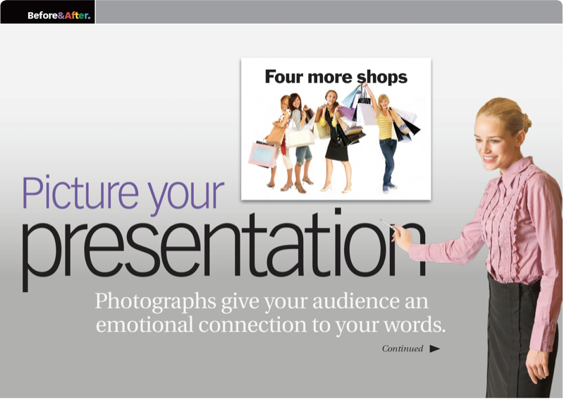 The first thing to understand is that you are the show; your audience has come to hear you, not read slides. Use a slide to fill your listeners’ minds with an image, then fill in the details orally. It’s fun! This 13-page article from issue 47 of Before&After Magazine encourages you to put away your text and graphs when you develop your presentations. To tell a story, you need the help of photos. Photos communicate on many channels. They wordlessly draw the audience into your world, make emotional connections, and prepare your listeners for what you have to say.