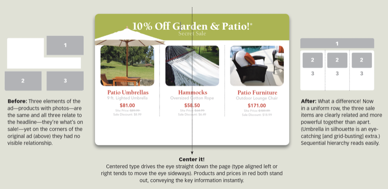 Things that are alike should look alike—same size, shape, position, alignment and so on. Gather the three sale items, and present them uniformly in a row followed by their descriptions, which are also typographically alike.