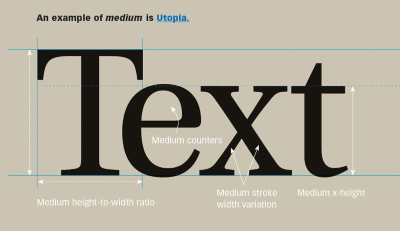 The x-height of a typestyle is the height of its lowercase characters. The larger the x-height, the denser the type will appear. You want medium; unusually tall or short x-heights are better suited for specialty projects.